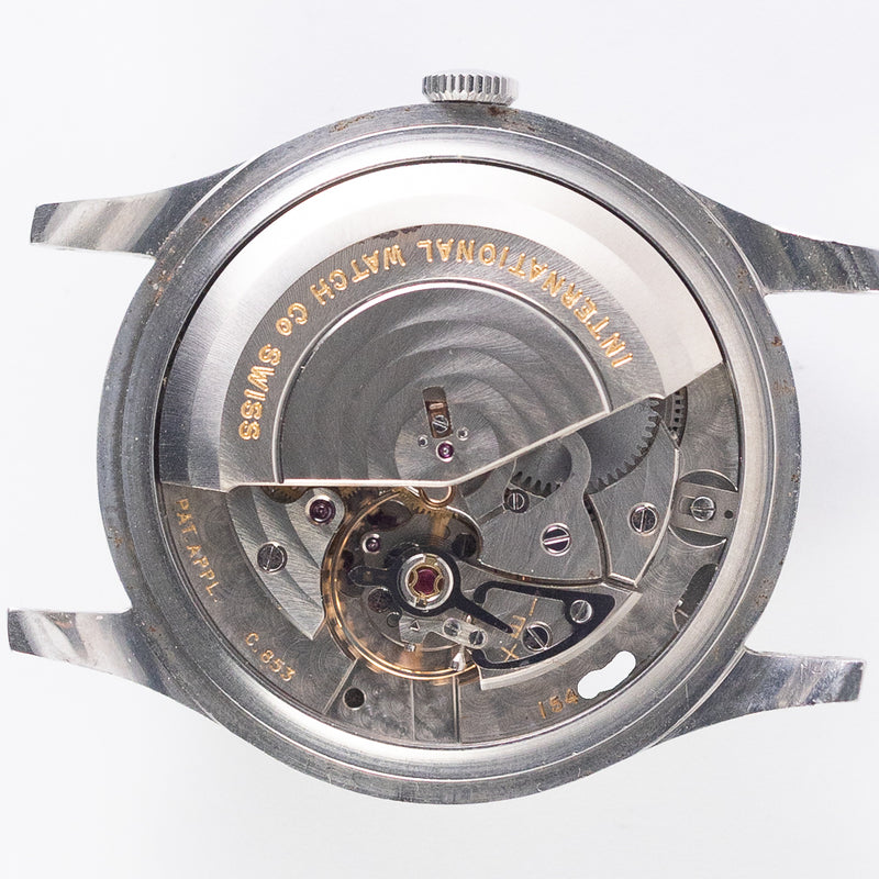 ムーブメントにはIWC自社製のCal.853が搭載されています。このムーブメントは、IWCが誇るペラトン方式の自動巻機構を採用。爪による両回転巻き上げを実現しており、その効率性と信頼性の高さは現在でも高い評価を得ています。ビーズが転がるような独特の巻き上げ音は、このムーブメントならではの特徴です。