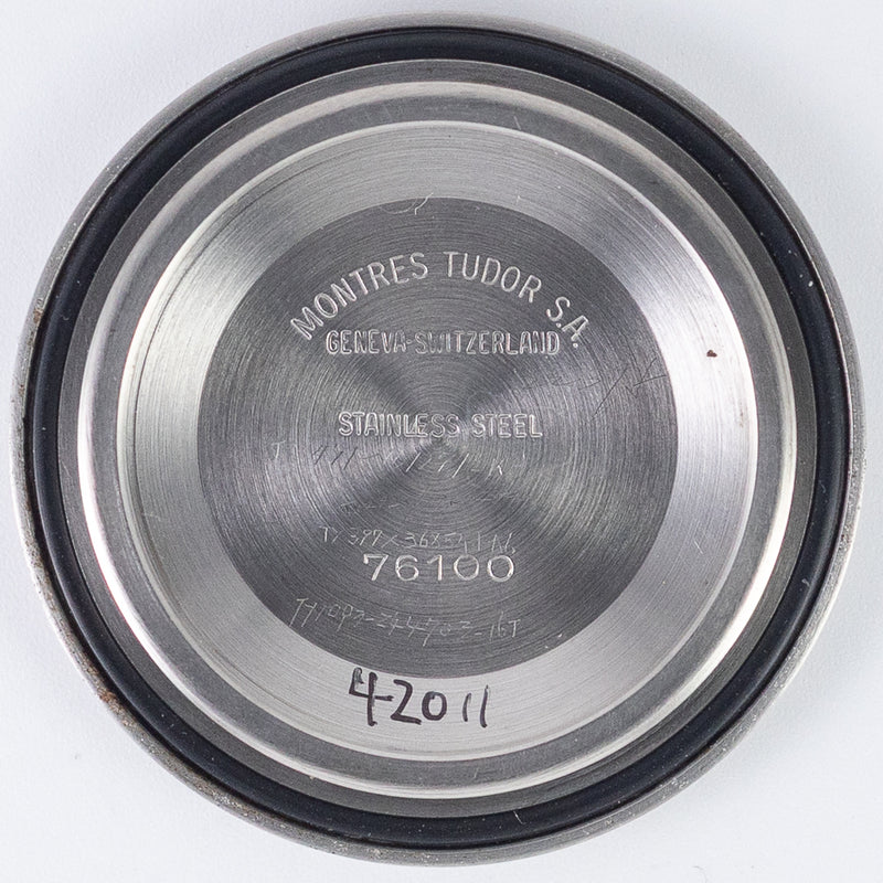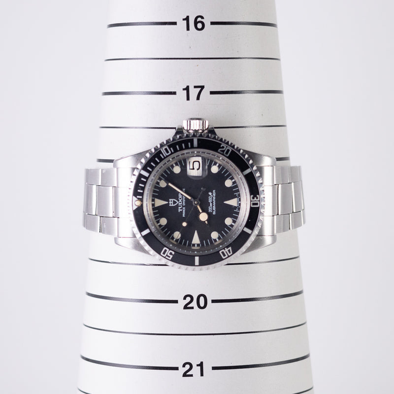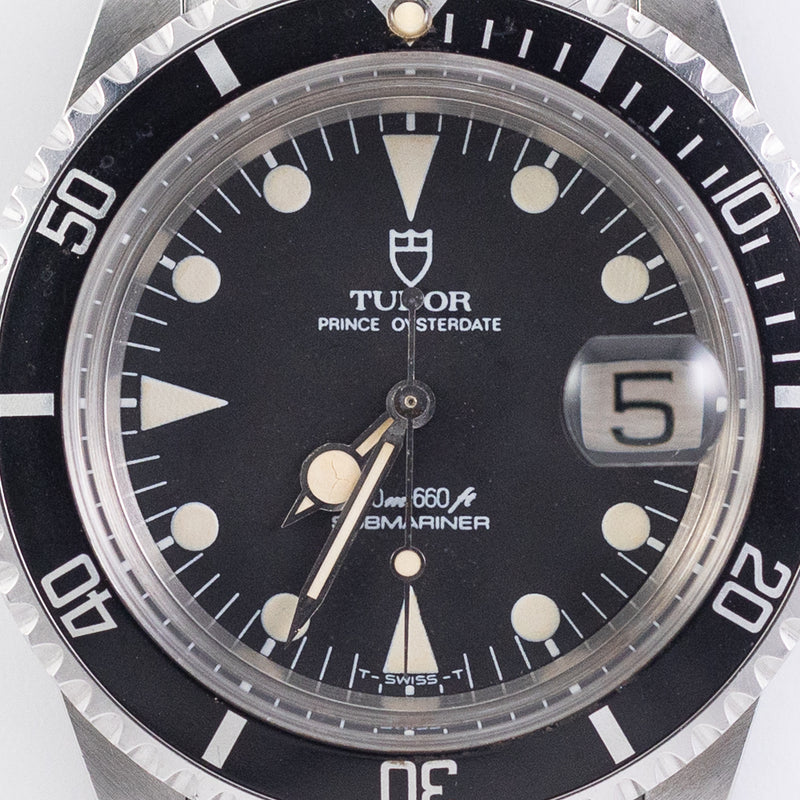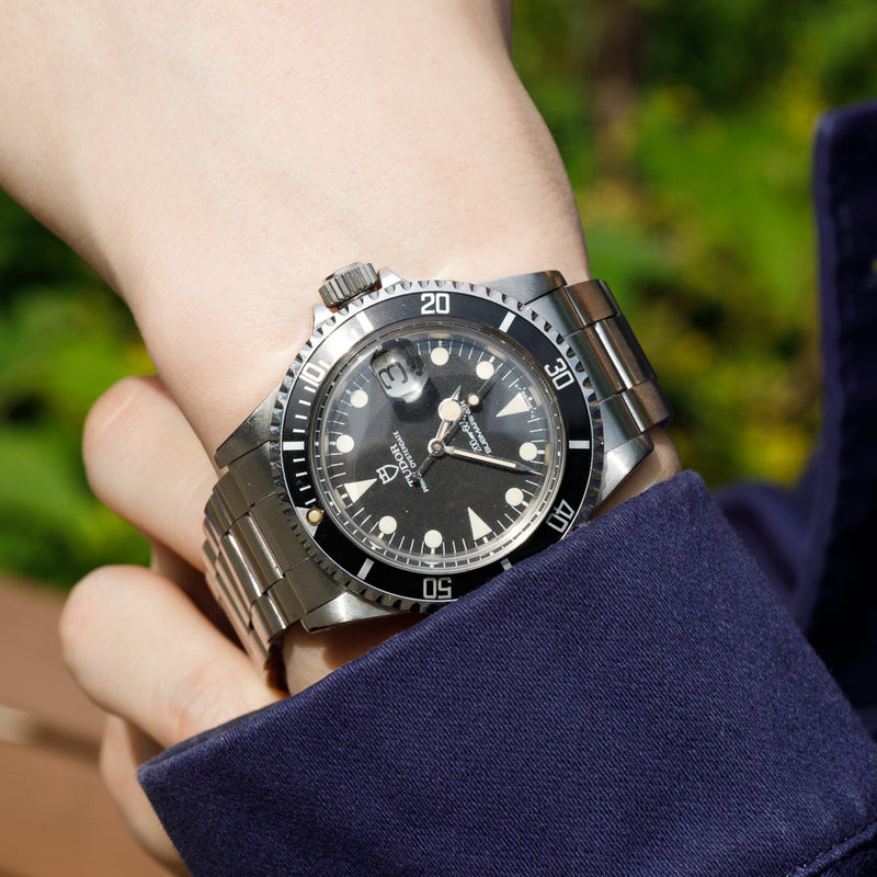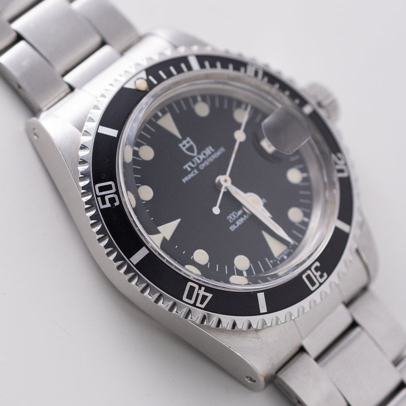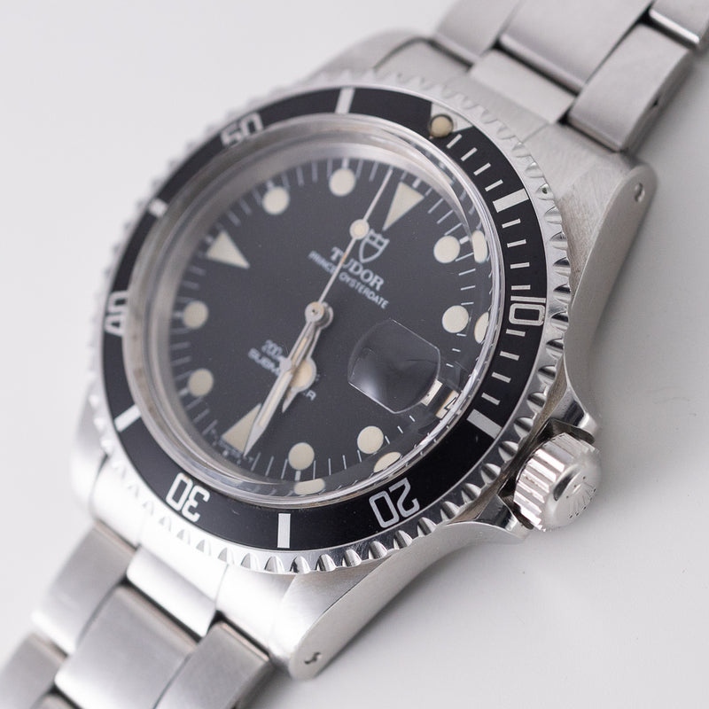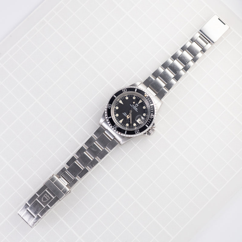 ブラックマットのダイヤルに夜光塗料のインデックスとタコ針を組み合わせた、チューダーのサブマリーナらしい端正な構成です。控えめながらも堅実なデザインで、ロレックスとの共有構造を保ちながらも独自の個性を持ったモデルです。ケースにはリューズガードを備え、裏蓋はロレックス製の刻印が見られるなど、この年代ならではのディテールが残されています。ブレスレットはフォールデッドタイプの9315で、380Bのエンドリンクが装着されています。