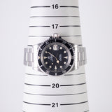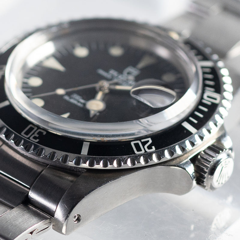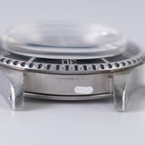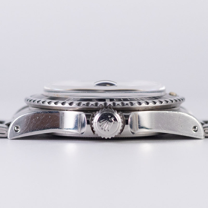ダイヤルはマットな質感を保ち、インデックスや針夜光のトリチウムには均一な経年変化が見られ、温かみのあるトーンに変化しています。ケースには細かな使用感があるものの、ラグのエッジやシェイプはしっかりと残されております。ベゼルの状態が素晴らしく、インサートの濃いブラックカラーはダメージなく残っています。フォールデッドブブレスレットは伸びが少なく、製造年代を考慮すると良好な状態を保っています。弊社にて分解清掃済みです。