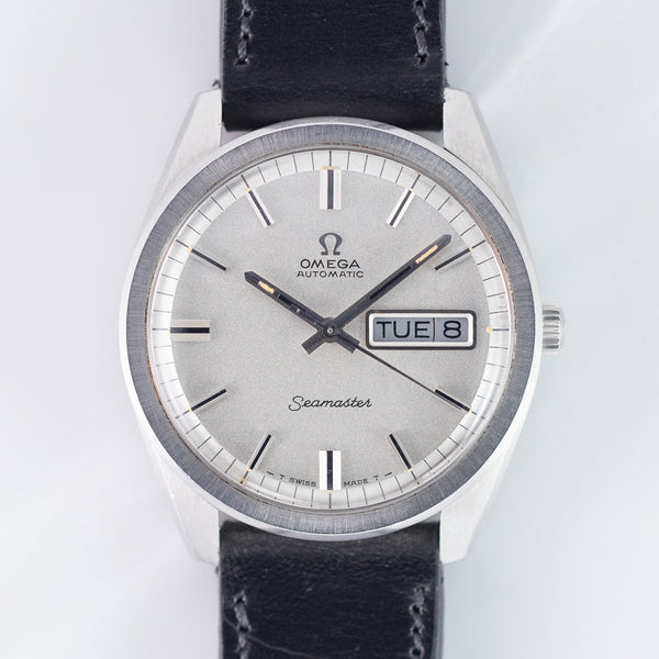 パッと見は70年代の時計に見えますが、60年代後半のモデル。主張の強めなバーインデックスやバーハンド、それに放射状の仕上げが施されたベゼルがその印象を強くしているのかもしれません。それでもケースの全体的なシルエットは60年代オメガのまさにそれ。その過渡期的なデザインが絶妙なバランス感覚を感じさせます。デイデイト機能やスクリューバック、すっきりしたデザインで汎用性の高い一本です。