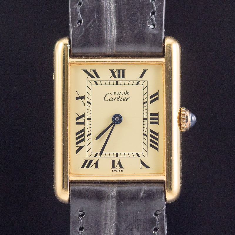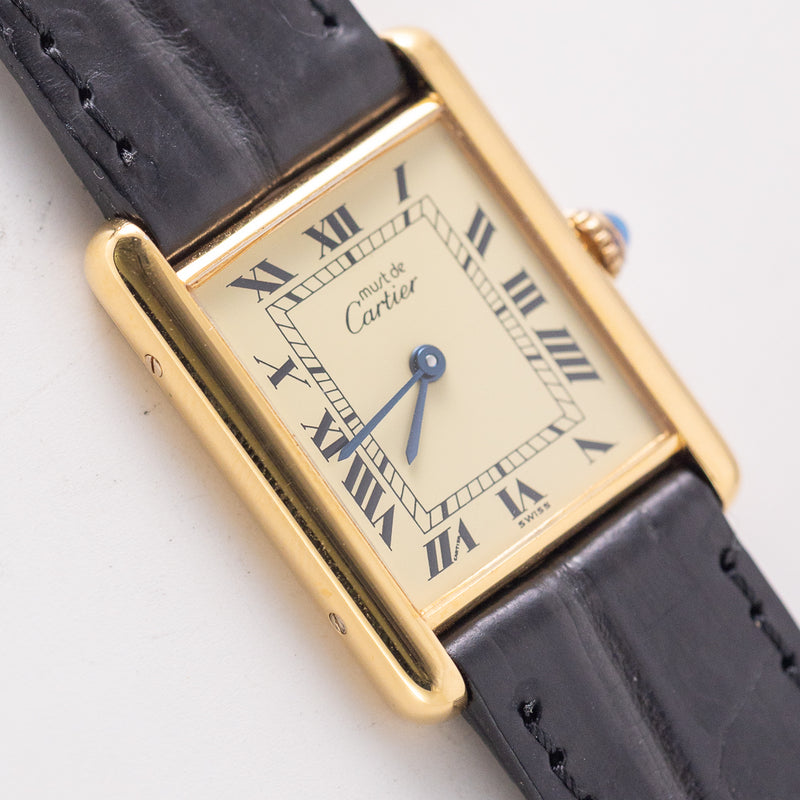 The ivory Roman dial is one of the most classic and iconic configurations in the Must de Cartier Tank line. The traditional ivory tone is beautifully complemented by blued steel hands and a blue sapphire cabochon crown. Large Model (LM) pieces with ivory dials have become increasingly scarce in today’s market.