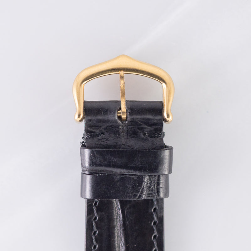 The case, including the glass, remains in excellent condition with minimal signs of wear. The strap is genuine crocodile leather and fitted with an original Cartier buckle, preserving the period-correct configuration. The dial is clean and free from stains or discoloration. While the model is known for developing hairline cracks over time, only minor ones are visible here and do not detract from the overall appearance. The watch has been fully serviced by us.