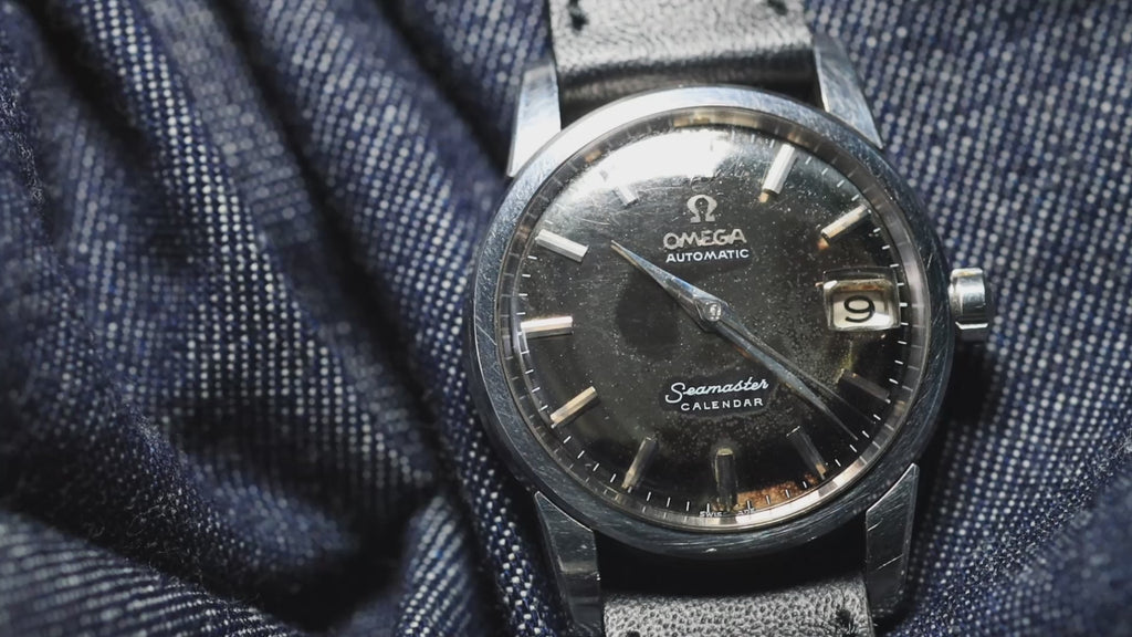OMEGA Seamaster Calendar Ref.2849。1950年代のシーマスターに見られる幅広のベゼルと太いラグを備えたケースデザインで、日付表示は3時位置。グレーのミラーダイヤルを搭載し、ホワイトプリントのレター、ドーフィンハンド、台形のバーインデックスという構成です。夜光は備えていない仕様です。