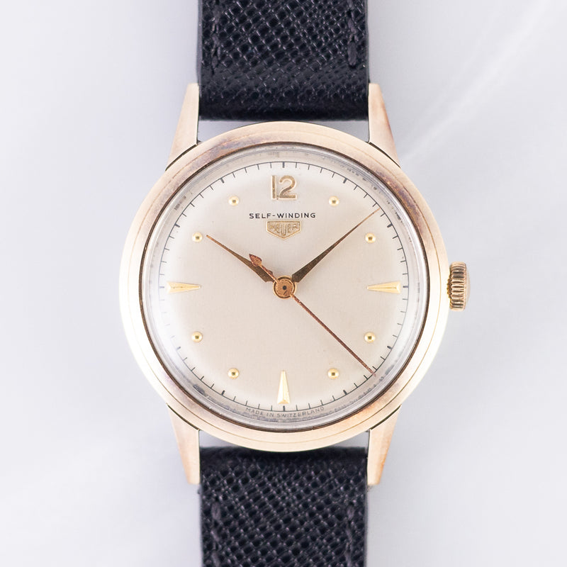 スポーツモデルの多いホイヤーの中でも珍しい、3針の手巻モデル。ラウンドケースに3面カットのラグが映え、キリッとした印象です。裏蓋はスクリューバックとなっています。ダイアルは中央が隆起したボンベ。インデックスはアラビアの12とドット、クサビをバランスよく配しています。時分針はアルファハンドで、分針と秒針は外周のチャプターリングまでしっかりと届いています。秒針の根元が膨れたデザインで、ヴィンテージらしく愛らしいです。裏蓋の刻印には防水、耐衝撃、耐磁を意味する英語が刻印されており、堅牢な造りを謳った時計であることがわかります。